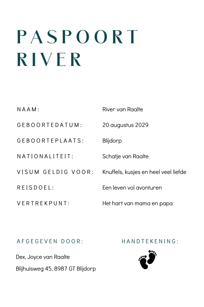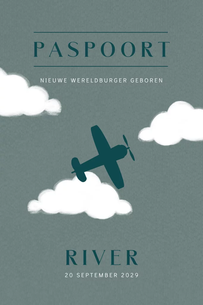 Stoer geboortekaartje voor een jongen in de vorm van een paspoort. Op dit paspoort geboortekaartje River zie je een vliegtuig tussen de wolken. Perfect voor ouders die van reizen houden en hun kleine wereldreiziger verwelkomen. Pas dit paspoort geboortekaartje voor jullie zoon naar eigen wens aan in onze online editor.