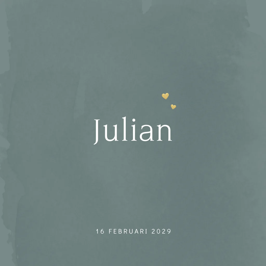 Basic geboortekaartje voor een jongen met een groene aquarel achtergrond, en twee kleine gouden hartjes maken dit kaartje Julian extra speciaal. Pas de teksten, kleuren en lettertypes naar je eigen smaak aan in de editor.