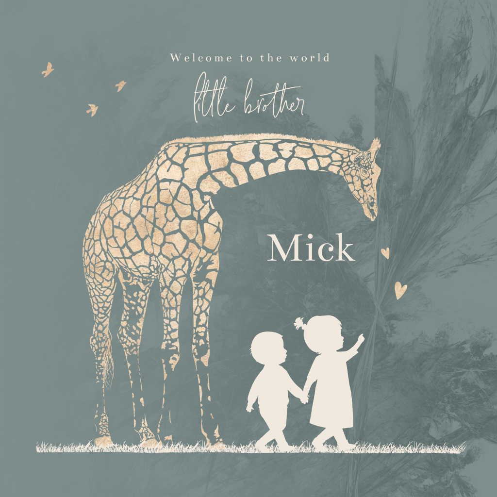 Hip geboortekaartje waarmee je iedereen kan laten weten dat jullie zoon is geboren. Op dit kaartje een klein broertje hand in hand met zijn grote zus. Een giraf lijkt over de kinderen te waken. Extra speciaal aan dit kaartje Mick zijn de ronde hoeken. In onze editor kun je de teksten, kleuren en lettertypes geheel naar eigen smaak aanpassen. Zodat het helemaal jullie eigen, unieke kaartje wordt!