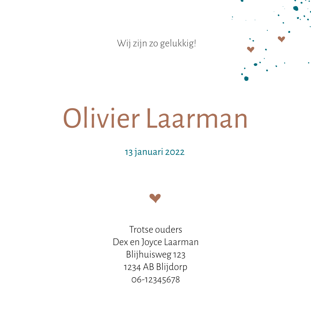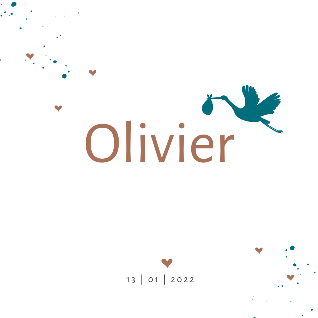 Rustig en clean geboortekaartje dat geschikt voor een jongen. Het is een eenvoudig ontwerp met aandacht voor de naam en op de voorkant een ooievaar. Deze kaart Olivier is eenvoudig aan te passen.