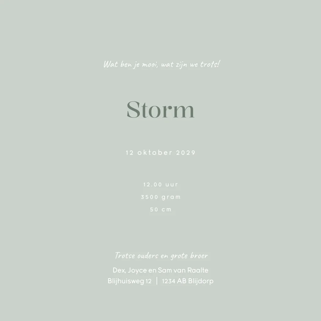 Een silhouet geboortekaartje in herfst sferen voor een jongen. Op dit geboortekaartje Storm zie je grote broer in de plassen stampen en een klein broertje in de bolderkar zitten met een paraplu. De zachte, groene kleurtinten zorgen voor een rustig geheel. Pas dit kaartje voor jullie zoon geheel naar eigen wens aan in de editor. De donkergroene envelopkleur maakt het helemaal af.