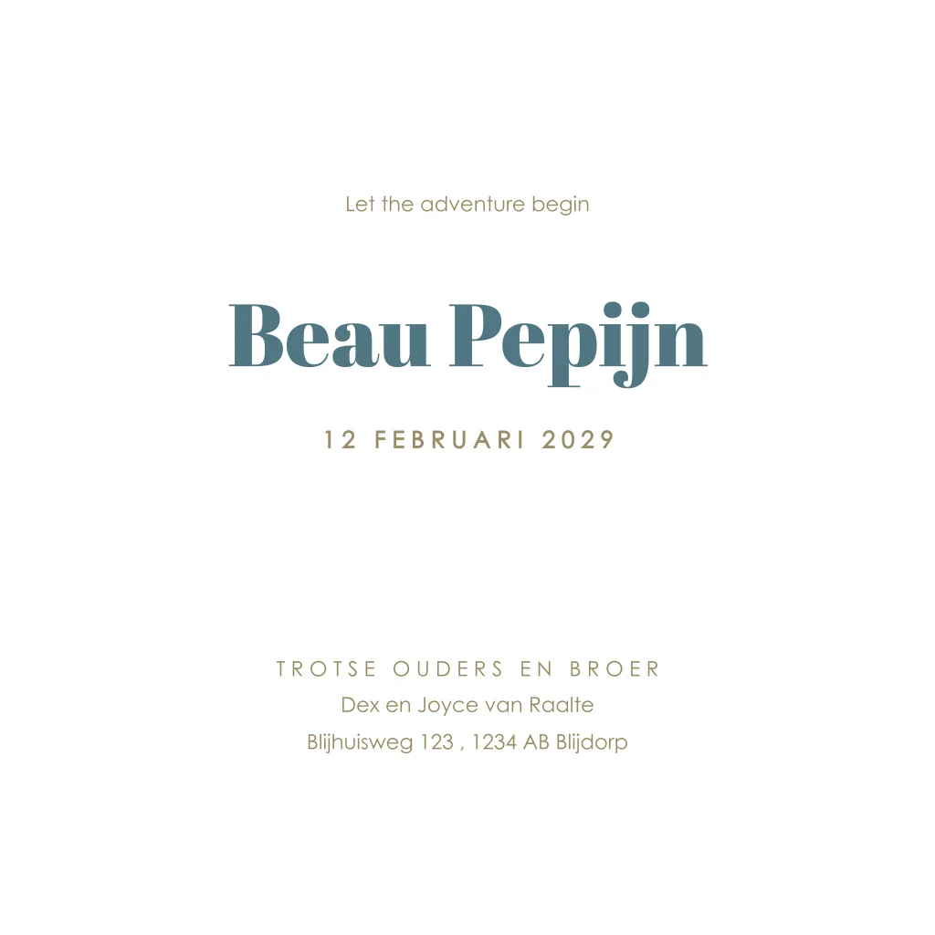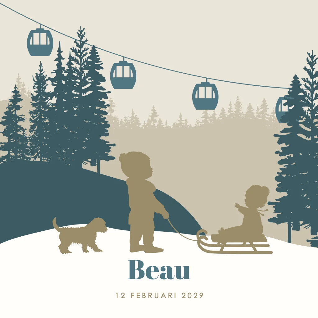 Silhouet geboortekaartje voor een tweede kindje, een broertje. Op dit winterse jongens geboortekaartje Beau zie je een winters landschap met sneeuw en een skilift. De grote broer (of zus) trekt een slee met daarop zijn of haar broertje. Er loopt een hondje met ze mee. Dit winter geboortekaartje voor een jongen is perfect voor als je een zoon verwacht in de winter of als jullie gek zijn van wintersport. Pas de teksten, kleuren en lettertypes naar je eigen smaak aan in de editor. Ook mogelijk in een andere gezinssamenstelling.