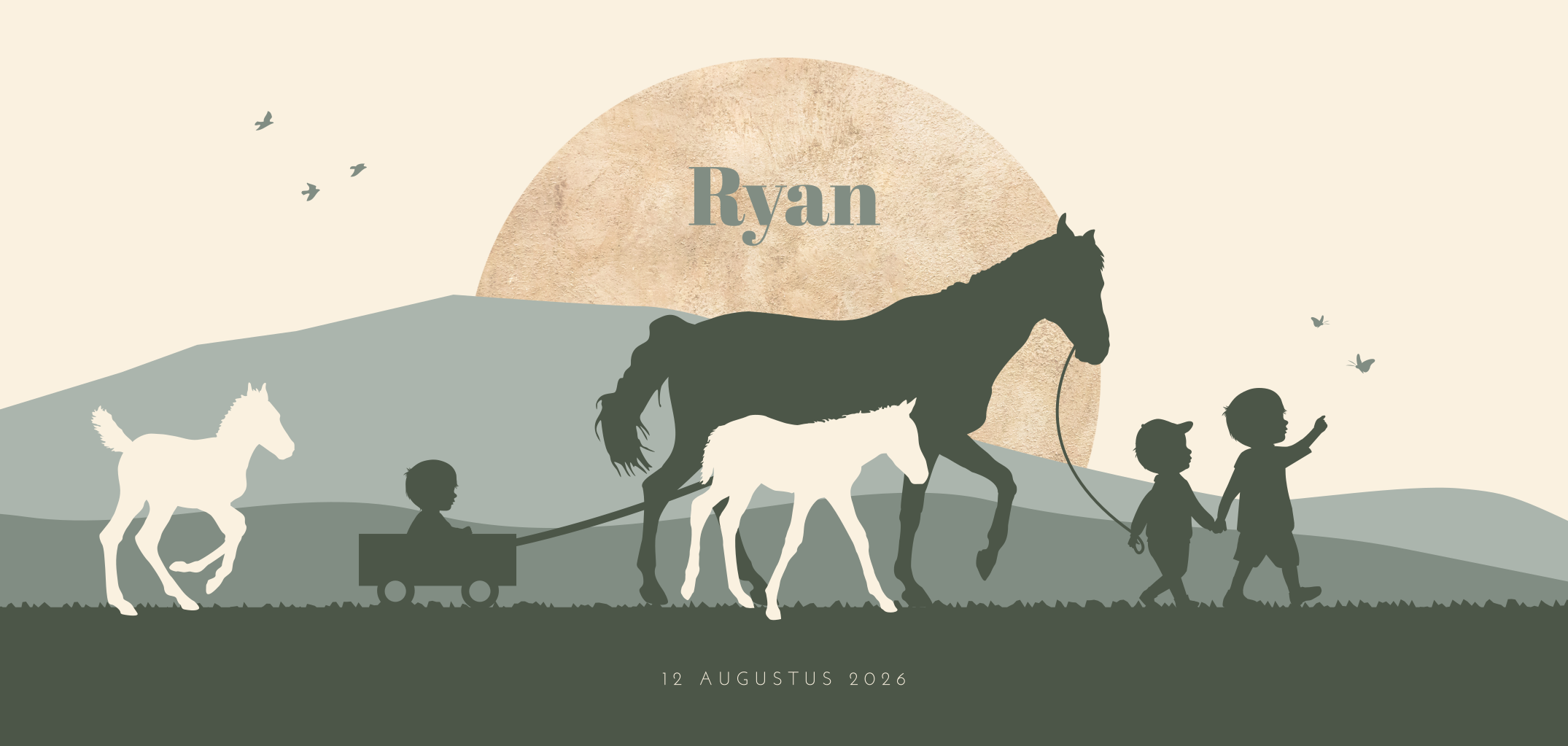Een avontuurlijk gezelschap samen op avontuur! Op dit geboortekaartje Ryan staan silhouetten van drie kindjes, twee grote broers en een klein baby broertje in een karretje. Samen met een paard en twee veulentjes. Op de achtergrond een ton-sur-ton heuvelachtig landschap met een zon. Teksten, kleuren en de silhouetten kun je gemakkelijk aanpassen in de editor. Dit silhouet geboortekaartje is ook mogelijk voor een andere gezinssamenstelling.