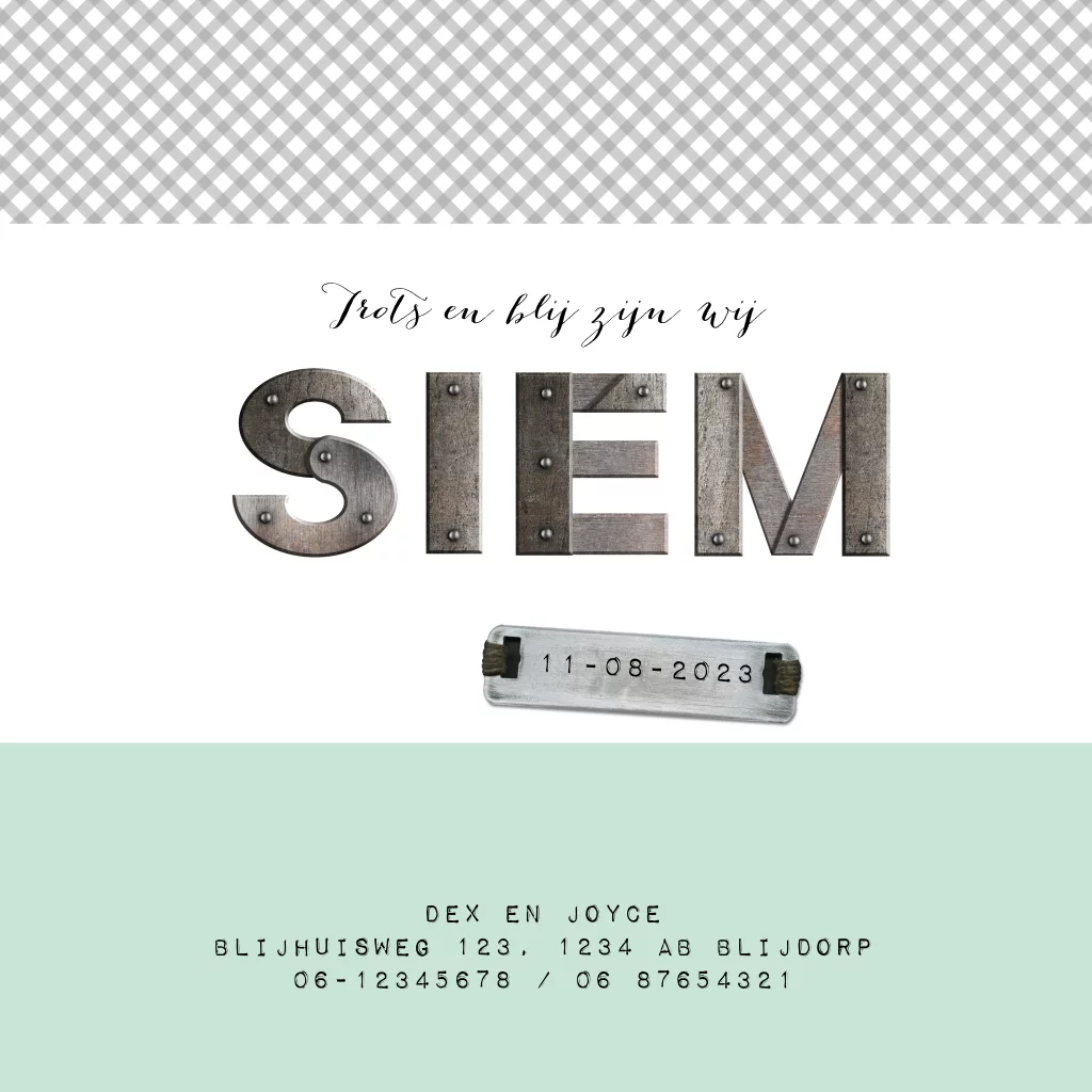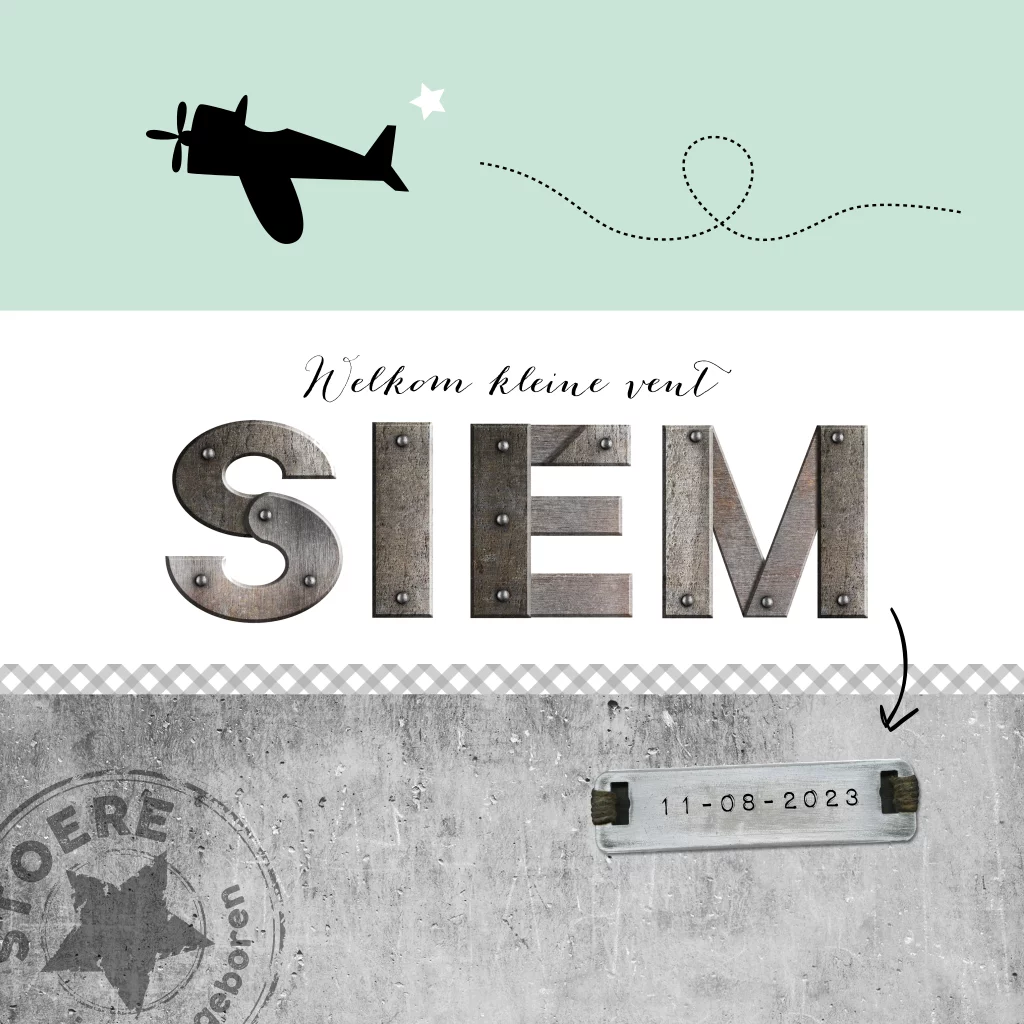 Dit leuke geboortekaartje voor een jongen heeft veel stoere elementen. Elementen zoals de metalen letters, een stempel met de tekst stoere jongen geboren en een metalen label met de geboorte datum. Het vliegtuigje en een ruitjes patroon maakt deze babykaart toch weer speels.
