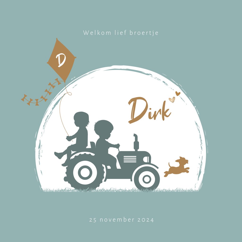 Hip silhouet geboortekaartje voor een tweede zoon. Op dit jongenskaartje Dirk zie je 2 broertjes samen op de tractor. Het kleine broertje zit achterop en heeft een vlieger in zijn hand. De grote broer bestuurt de tractor en een klein hondje rent voor ze uit. Op de achtergrond een mooie trendy groene kleur. Pas het kaartje naar je eigen smaak aan in de editor. Ook mogelijk met een ander silhouet of voor een andere gezinssamenstelling.