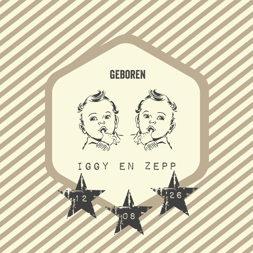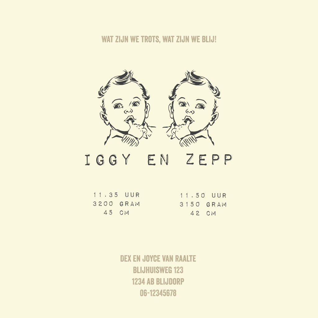 Dit retro geboortekaartje is voor een jongen-meisje tweeling. Op deze kaart met vintage look staat een illustratie van 2 baby's. De geboortegegevens staan vermeld in sterren.