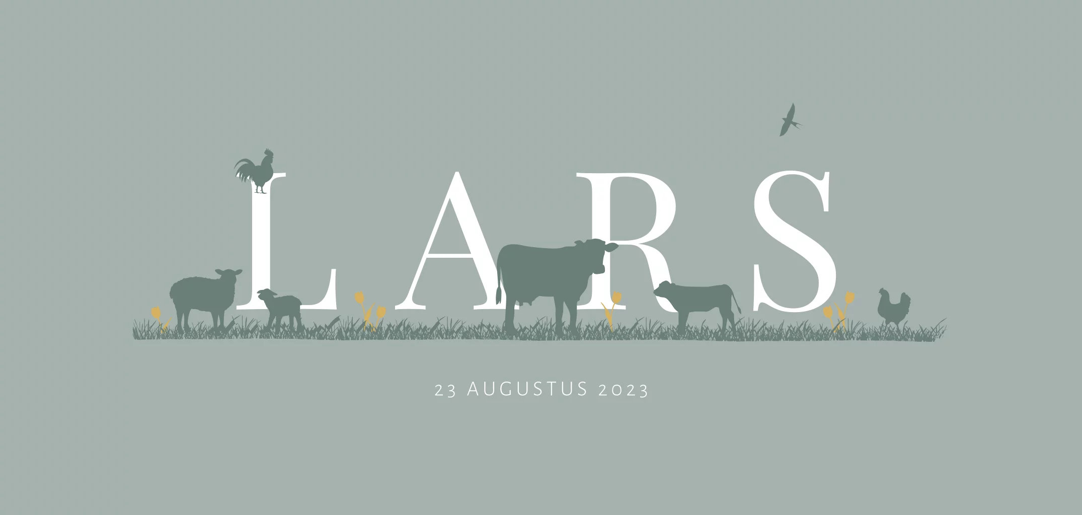 Boerderij geboortekaartje voor een zoon. Op dit jongenskaartje Lars staat de naam groot op de kaart. Tussen én op de letters van de babynaam staan verschillende boerderij dieren, waaronder een koe, kalfje, schaap, kip en een haan. Teksten en kleuren zijn aan te passen in de editor. Ook kun je gemakkelijk andere dieren toevoegen om je kaartje helemaal naar wens te maken.