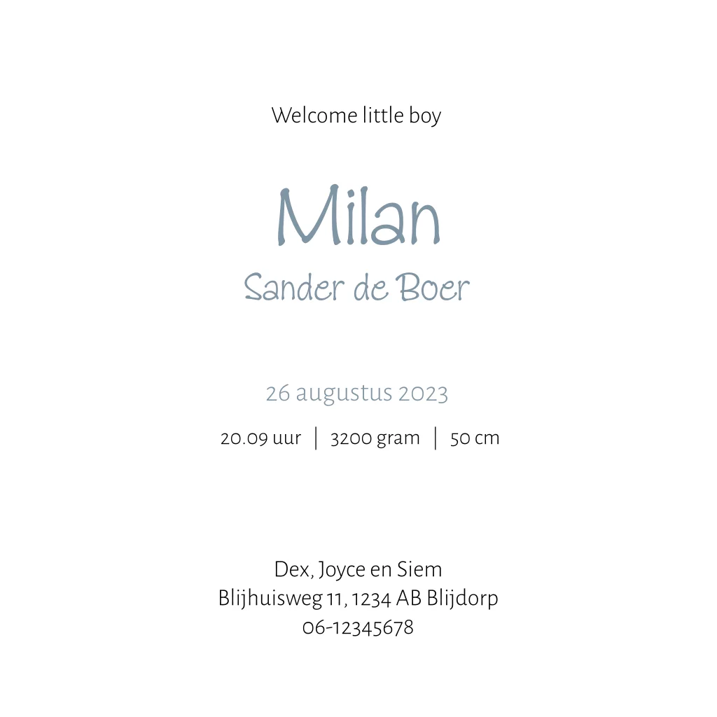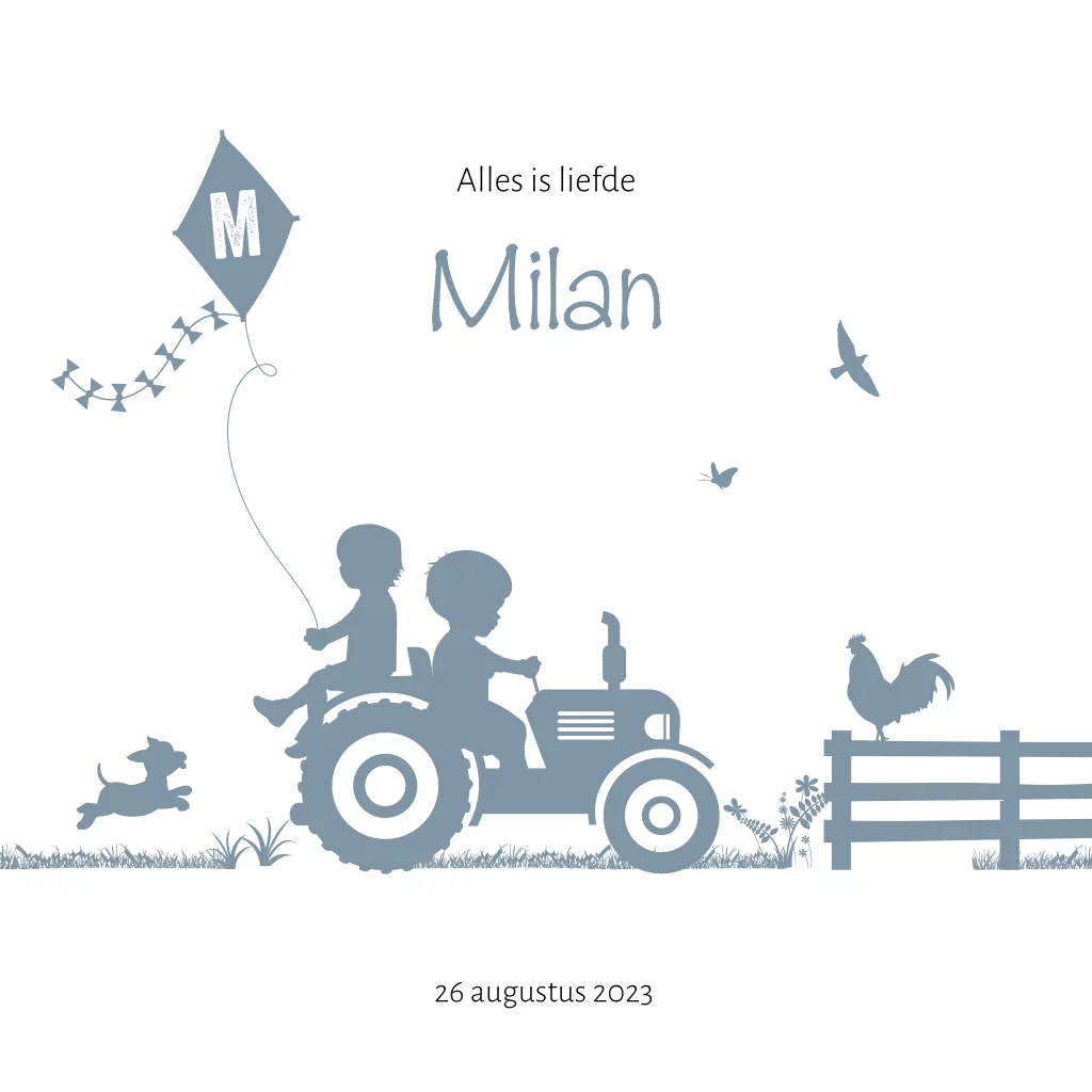 Een hip geboortekaartje voor een broertje. Op dit boerderij kaartje Milan staan 2 broertjes die samen op de tractor rijden. Het kleine broertje achterop heeft een vlieger in de hand. Verder staan er op dit kaartje een hek, hondje en haan. Kleuren en lettertypes zijn aan te passen in de editor.