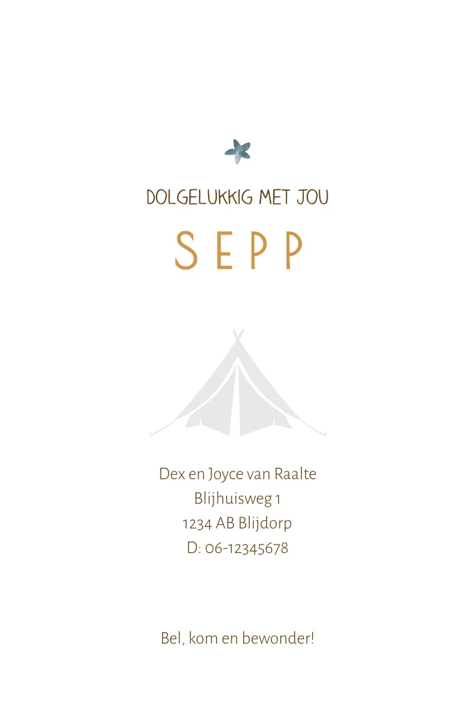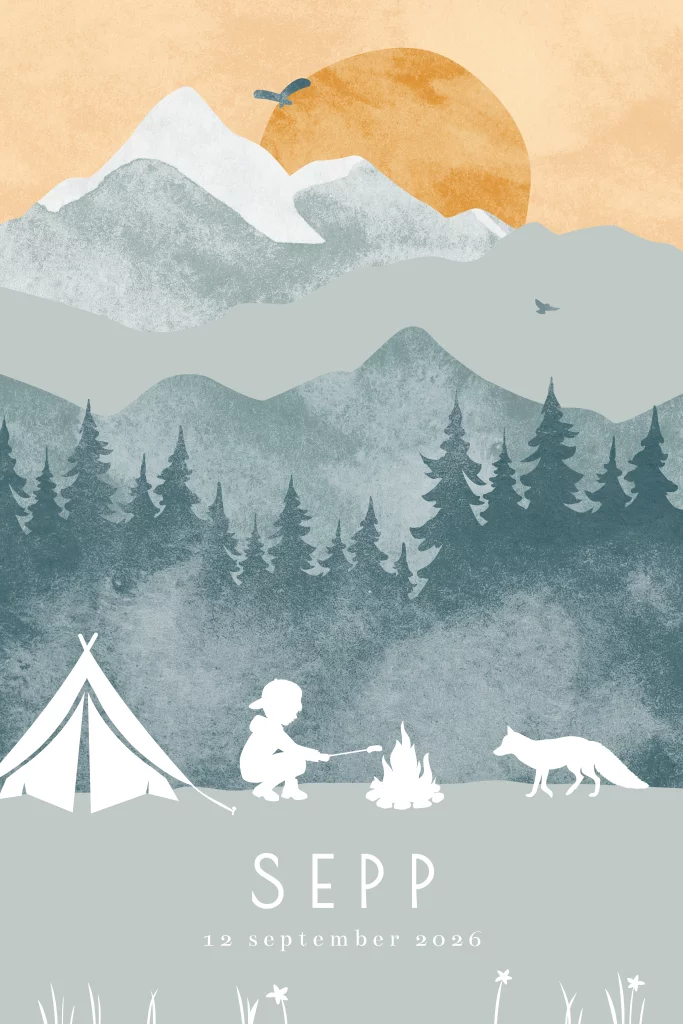 Silhouet geboortekaartje voor een zoon met een kindje dat aan het kamperen is in de bergen. Op dit kaartje Sepp een jongetje die een worstje opwarmt bij het kampvuur naast een tent. Op de achtergrond een ondergaande zon. Teksten en lettertypes pas je eenvoudig aan in de editor. Ook mogelijk met een ander silhouet of voor een andere gezinssamenstelling.
