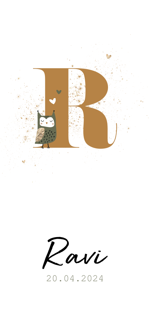 Geboortekaartje voor een zoon waarop de eerste letter van de babynaam groot op de kaart staat. Rondom de voorletter staat een lief uiltje, kleine spetters en hartjes. Dit jongenskaartje Ravi is overwegend wit en oogt daardoor clean. Kleuren en lettertypes zijn aan te passen in de editor.