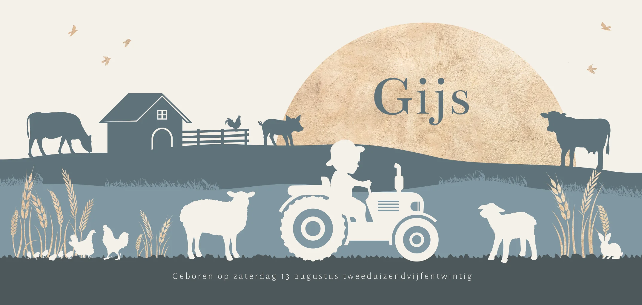 Boerderij geboortekaartje met boerderijdieren en een jongen op een tractor. Op dit hippe silhouet geboortekaartje Gijs staan schapen, koeien, een varken, kippen en een haan op een boeren hek. Het graan, gras en de heuvels op de achtergrond zorgen voor een landelijke stijl. Teksten, kleuren en de silhouetten kun je gemakkelijk aanpassen in de editor. Dit geboortekaartje is ook mogelijk voor een andere gezinssamenstelling.