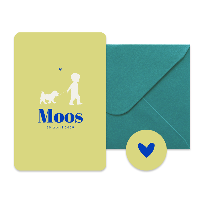 Een tof geboortekaartje voor een jongen met opvallende kleuren. Dit geboortekaartje Moos heeft een silhouet van een jongetje met een hondje. Dit kaartje voor jullie zoon is opvallend vormgegeven qua kleur en heeft speelse ronde hoeken. Pas dit geboortekaartje naar eigen wens aan en maak dit geboortekaartje af met de petrol envelopkleur.
