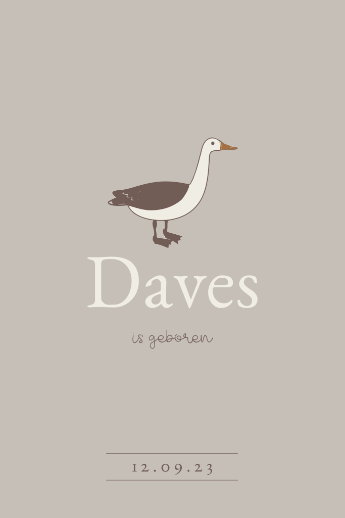 Lief, rustig geboortekaartje voor een jongen. Op dit kaartje Daves een gans in het midden van de kaart. Dit kaartje heeft afgeronde hoeken, nog net even een tikje specialer dus. Teksten en lettertypes pas je eenvoudig aan in onze ontwerpmodule. Vragen? We helpen je graag!