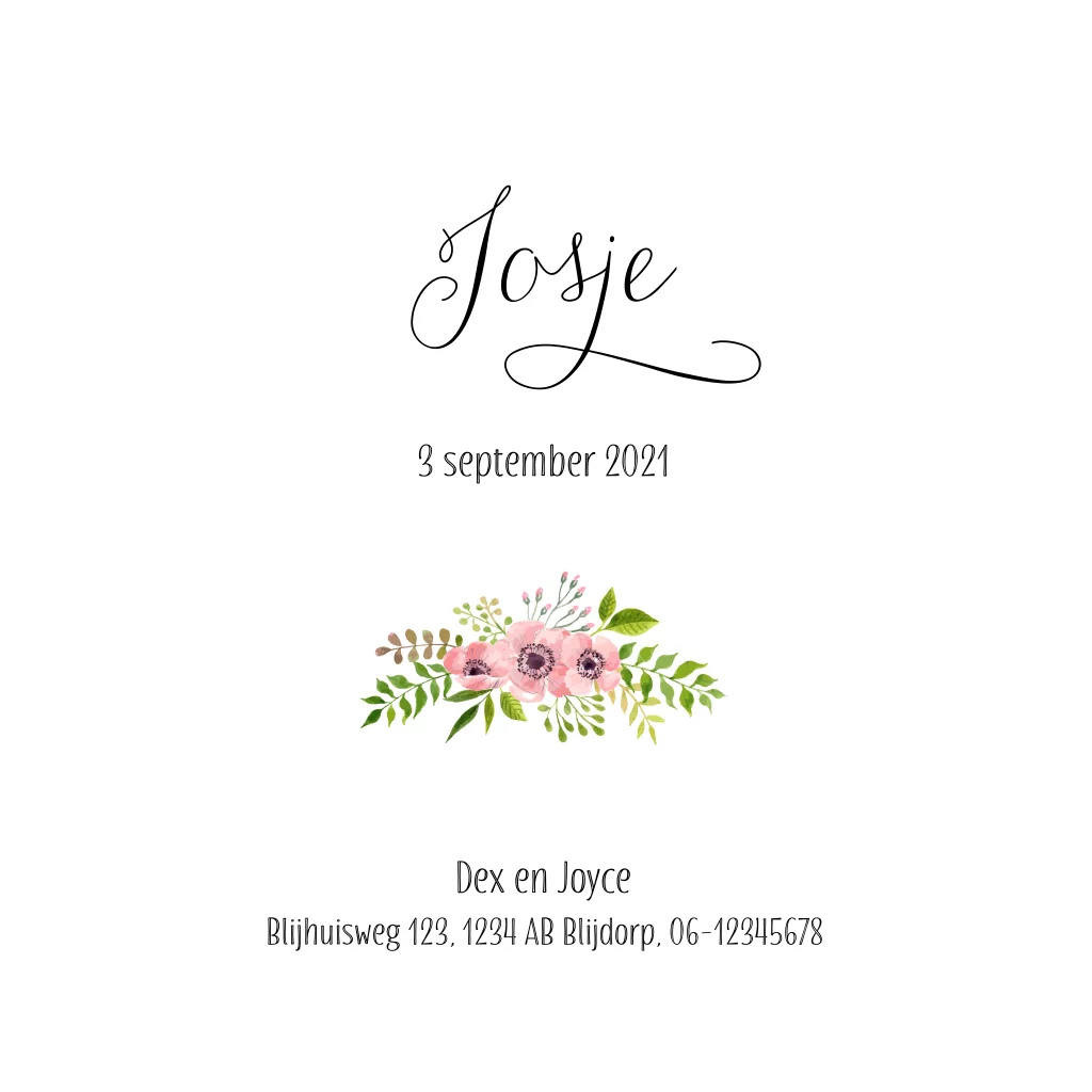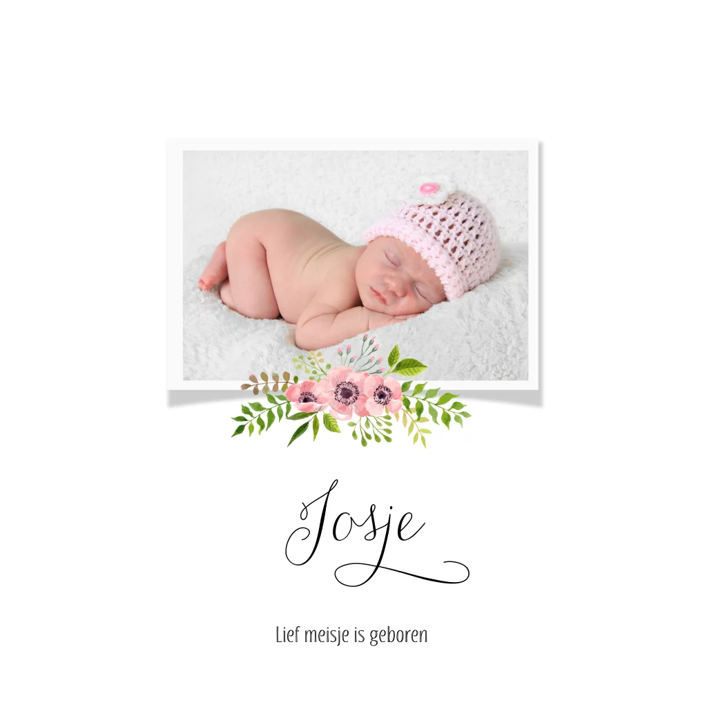 Dit foto geboortekaartje voor een meisje heeft een lief en romantische uitstraling door de bloemen die er in zijn verwerkt. De baby foto op de kaart maakt het extra schattig en geeft een persoonlijke tint aan de kaart.