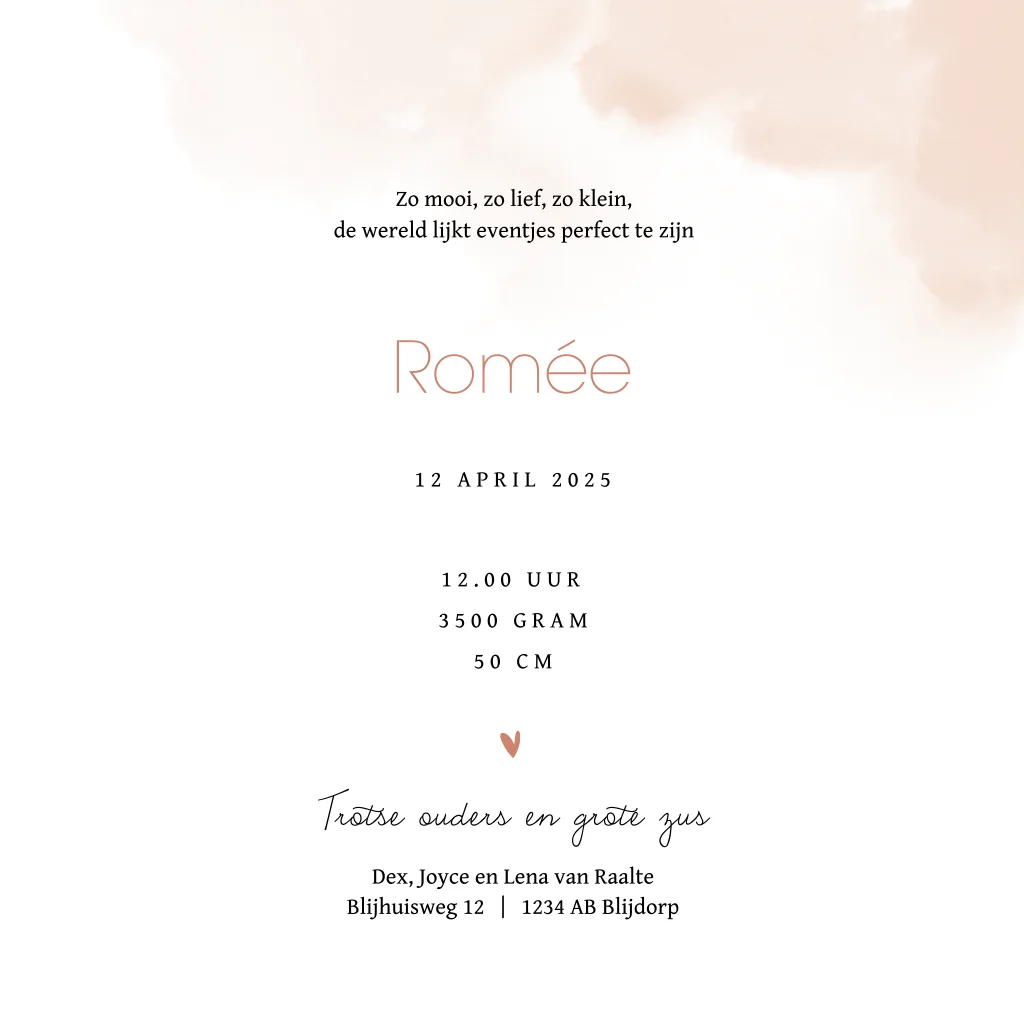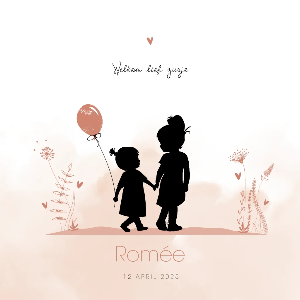Silhouet geboortekaartje voor een tweede kindje, een dochter. Op dit baby kaartje met de naam Romee zie je een grote zus hand in hand samen met haar kleine zusje. Het kleinste meisje heeft een ballon in haar hand. Verder op dit kaartje een roze aquarel achtergrond, mooie veldbloemen en kleine hartjes in trendy terra kleur. Dit silhouet kaartje met 2 meisjes is gemakkelijk aan te passen en ook mogelijk in een andere gezinssamenstelling.