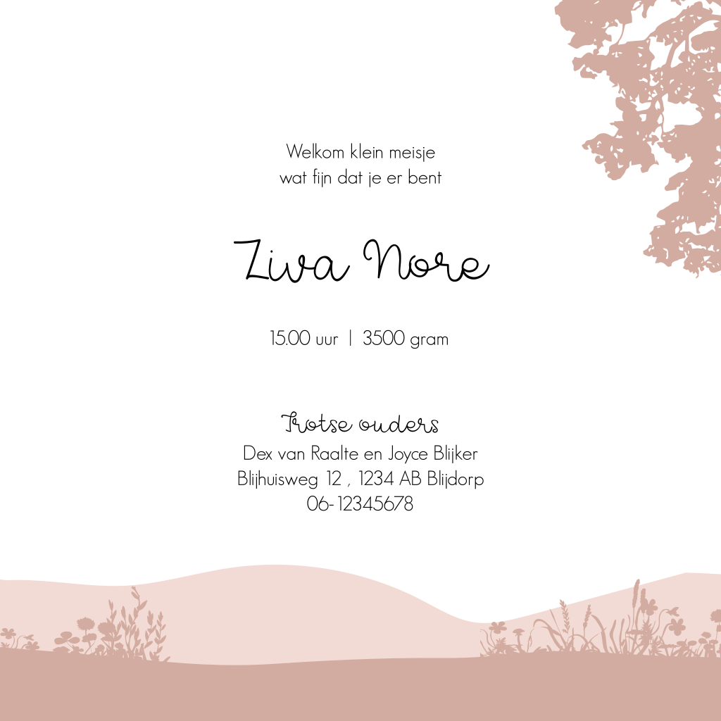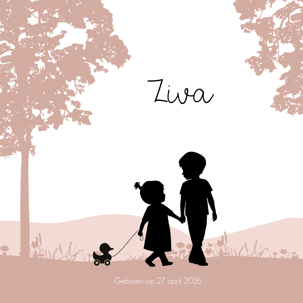 Silhouet geboortekaartje in roze ton-sur-ton kleuren voor een tweede kindje. Op dit meisjeskaartje Ziva zie je een grote broer hand in hand lopen met zijn zusje. Het meisje heeft een speelgoedeendje vast. Op de achtergrond een heuvellandschap met bomen en bloemen.