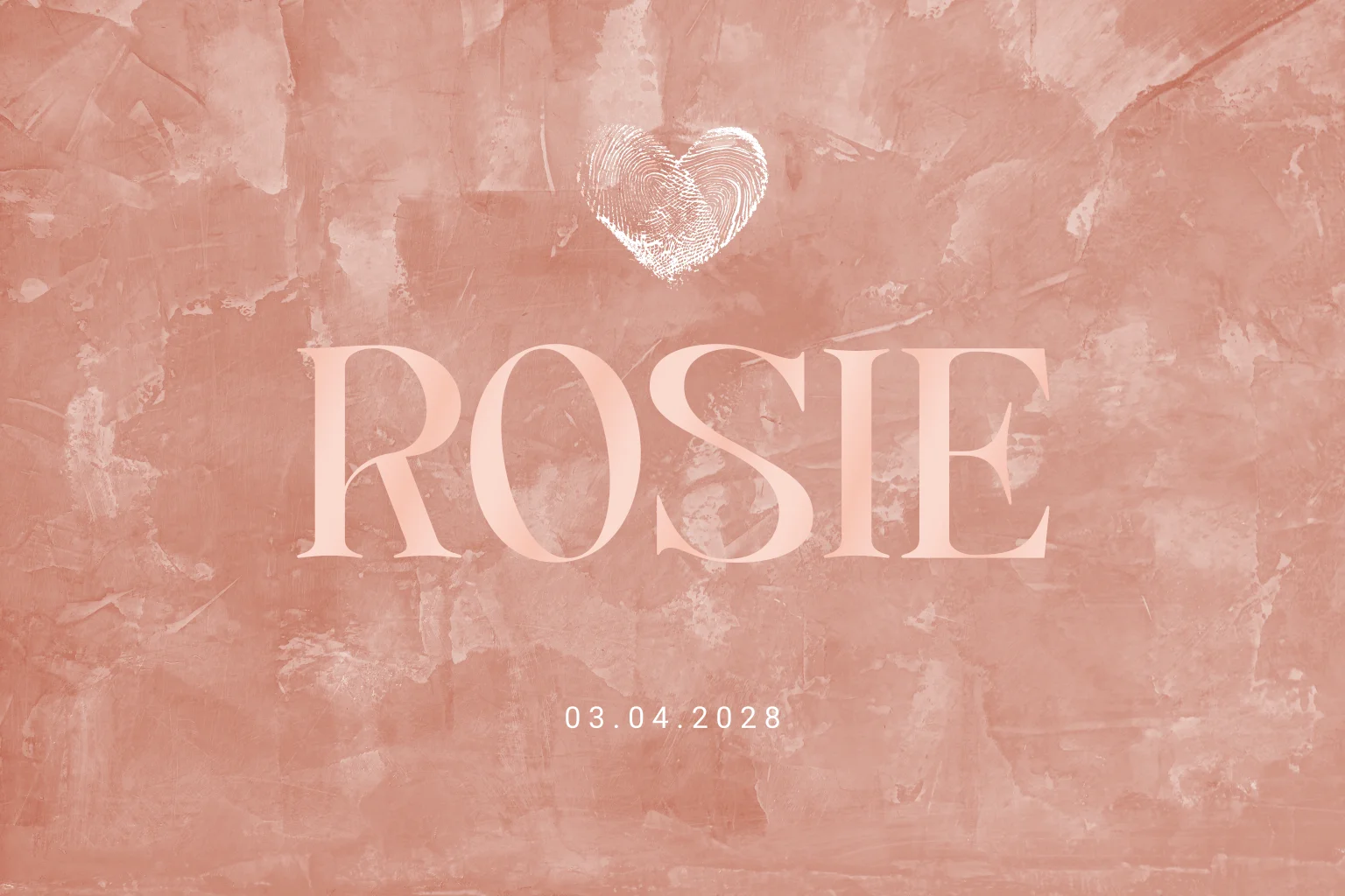 Heb je het mooie fingerprint geboortekaartje gezien bij Anne Vedder voor haar zoon Maas en wil je dit kaartje ook, alleen dan voor je dochter? Wij hebben dit kaartje aangepast naar een meisjeskaartje! De achtergrond heeft een zachte oudroze betonlook met de naam van jullie meisje in hoogglans spot-uv lak. Spot-uv is een luxe hoogglans afwerking van glanzende lak om de naam van jullie dochter extra op te laten vallen. Boven de babynaam Rosie staat een vingerafdruk hartje. De afgeronde hoeken maken het geheel helemaal af.