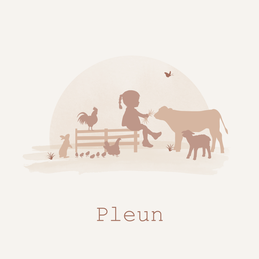 Boerderij silhouet geboortekaartje voor een meisje met boerderij dieren, zoals een koe, kalf, schaap, lam, konijn en kippen. Op dit babykaartje staat de naam Pleun voert het meisje de boerderijdieren.