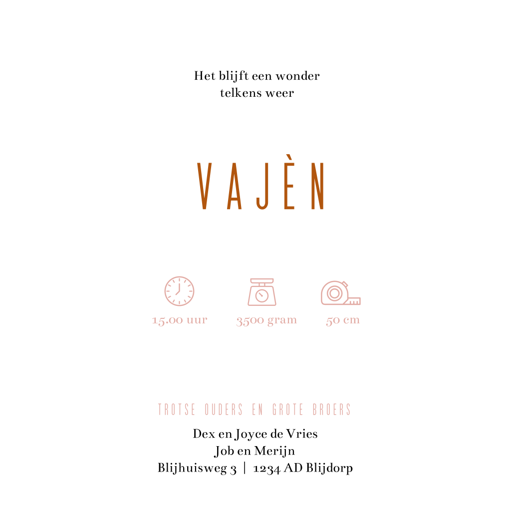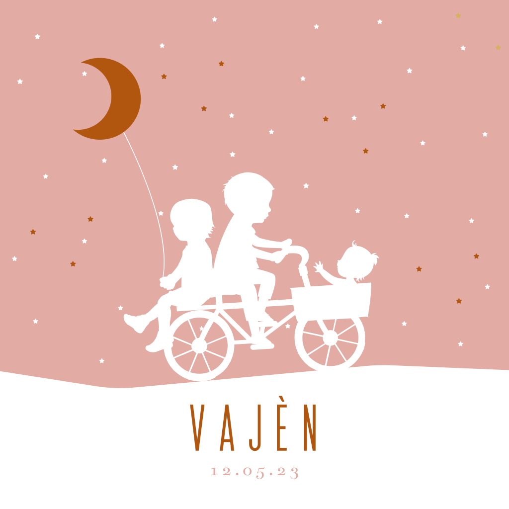 Geboortekaartje voor een derde kindje, een meisje, met een maan en sterren. Op dit kaartje Vajèn staat een silhouet van 2 grote broers samen met een baby zusje op de fiets. Een mooie kleurencombinatie van oud roze met wit en koperkleur. De teksten en kleuren kun je aanpassen in de editor. Ook mogelijk met een ander silhouet of andere gezinssamenstelling.