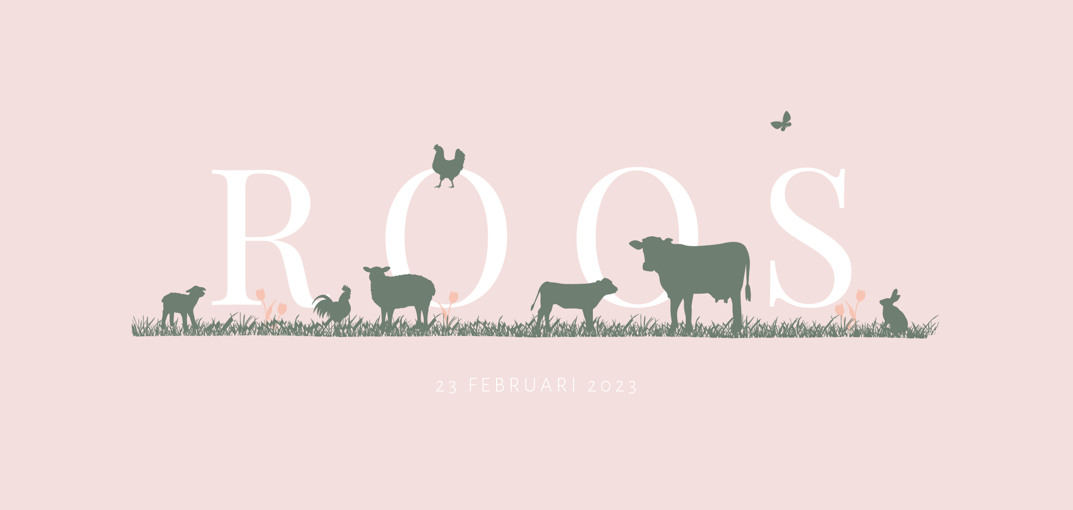 Boerderij geboortekaartje voor een dochter. Op dit meisjeskaartje Roos staat de naam groot op de kaart. Tussen en op de letters van de babynaam staan verschillende boerderij dieren, waaronder een koe, kalfje, lammetje, kip en een konijntje. Teksten en kleuren zijn aan te passen in de editor. Ook kun je gemakkelijk andere dieren toevoegen om je kaartje helemaal naar wens te maken.