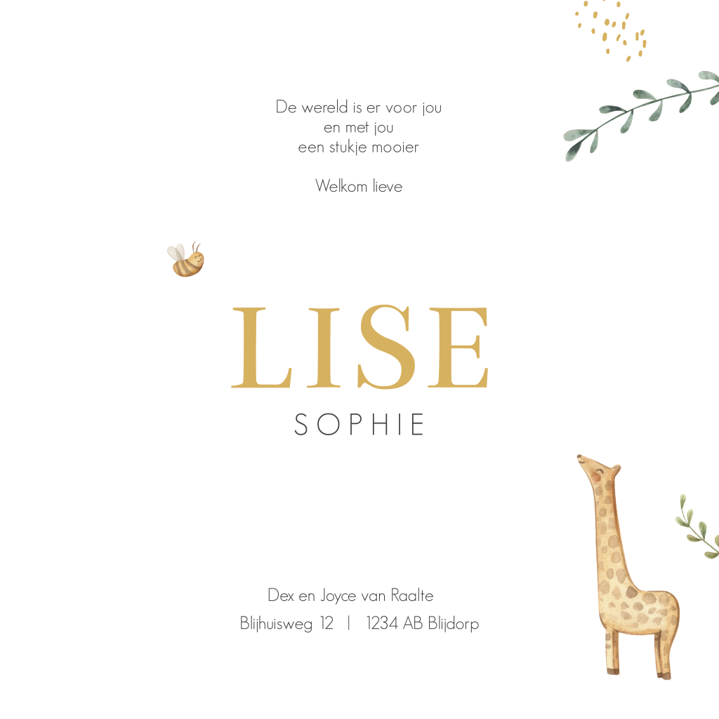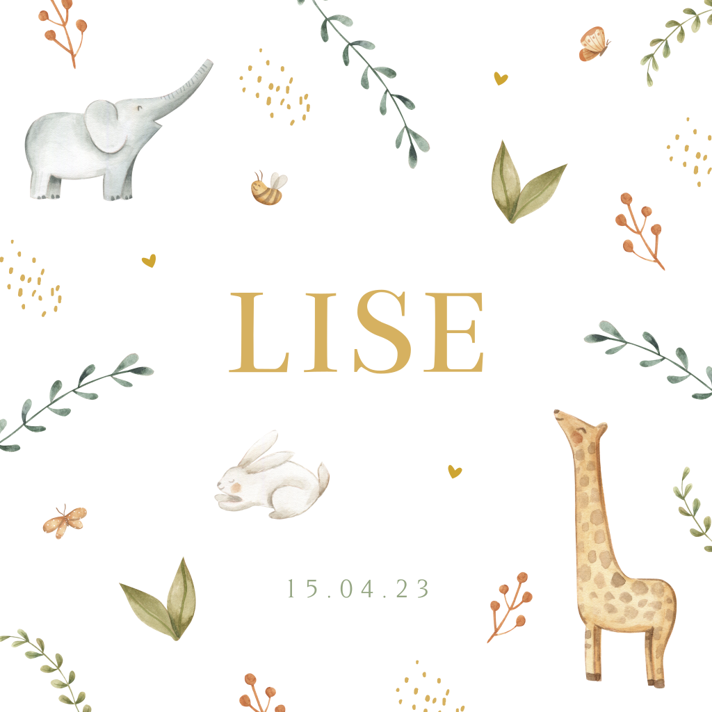 Lief geboortekaartje voor een meisje met verschillende vrolijke dieren, waaronder een olifantje, konijntje, giraffe, bij en vlinder. De teksten en kleuren van dit kaartje Lise zijn aan te passen in de editor.