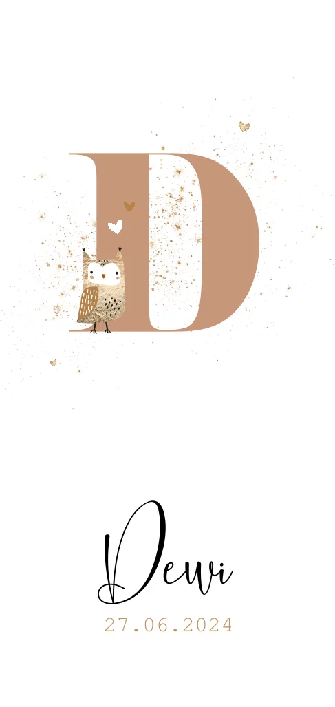 Geboortekaartje voor een dochter waarop de eerste letter van de babynaam groot op de kaart staat. Rondom de voorletter staat een lief uiltje, kleine spetters en hartjes. Dit meisjeskaartje Dewi is overwegend wit en oogt daardoor clean. Kleuren en lettertypes zijn aan te passen in de editor.