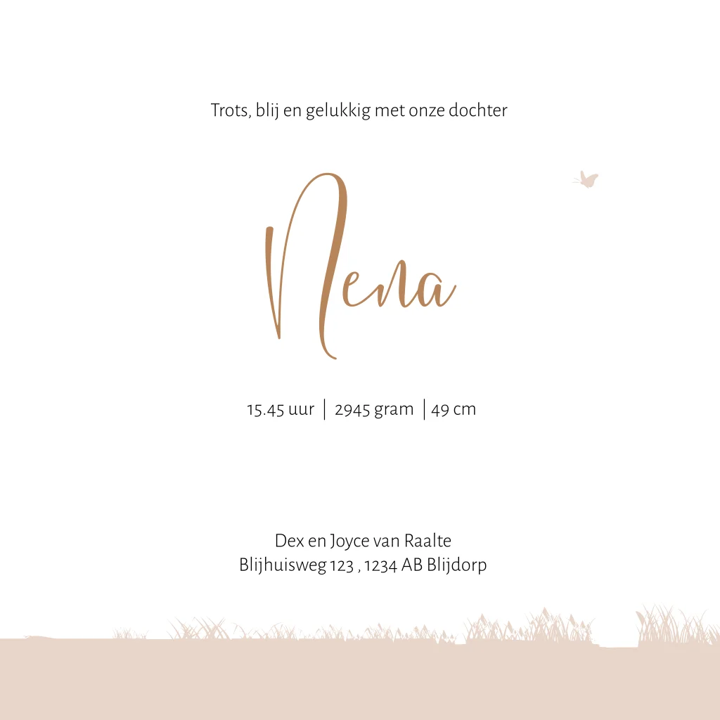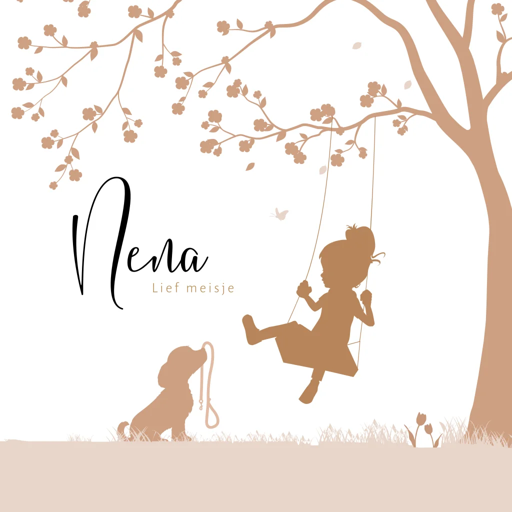 Hip silhouet geboortekaartje voor een meisje in trendy kleuren die helemaal van nu zijn! Op dit kaartje Nena zie je een meisje op de schommel, een boom en een lief klein hondje. Pas het kaartje naar je eigen smaak aan in de editor en combineer met een mooie envelop om het helemaal af te maken.