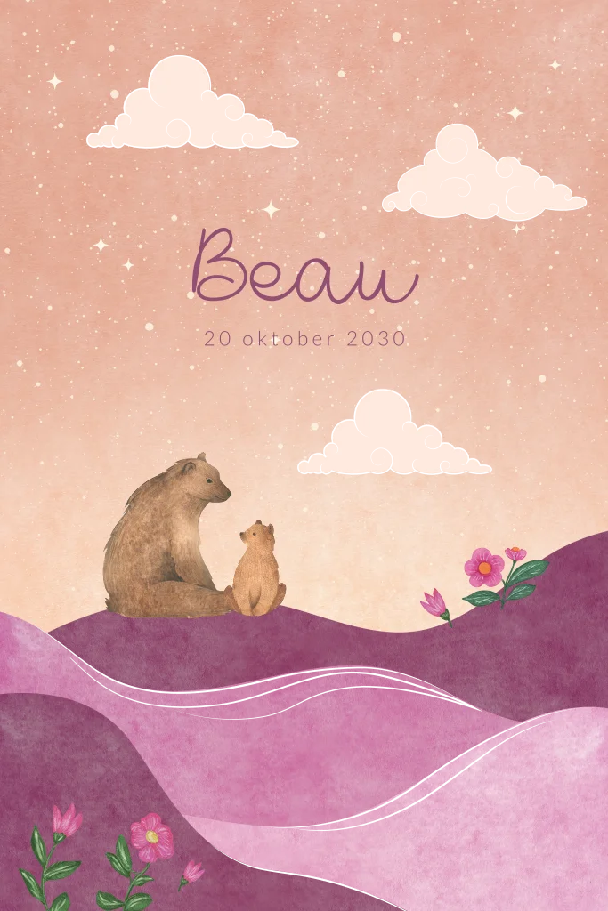 Een vrolijk geboortekaartje voor een meisje. Op dit kaartje Beau zie je een heuvel landschap in zachte paarse tinten met een pastel oranje lucht met sterren en wolken. Op de heuvel zitten twee beertjes, een moeder of vader beer met zijn of haar welp. Dit meisjes geboortekaartje heeft een vintage en boho uitstraling met een eclectic touch. De goudfolie accenten maken dit kaartje extra magisch! De berry kleurige envelop past perfect bij dit geboortekaartje voor jullie dochter.
