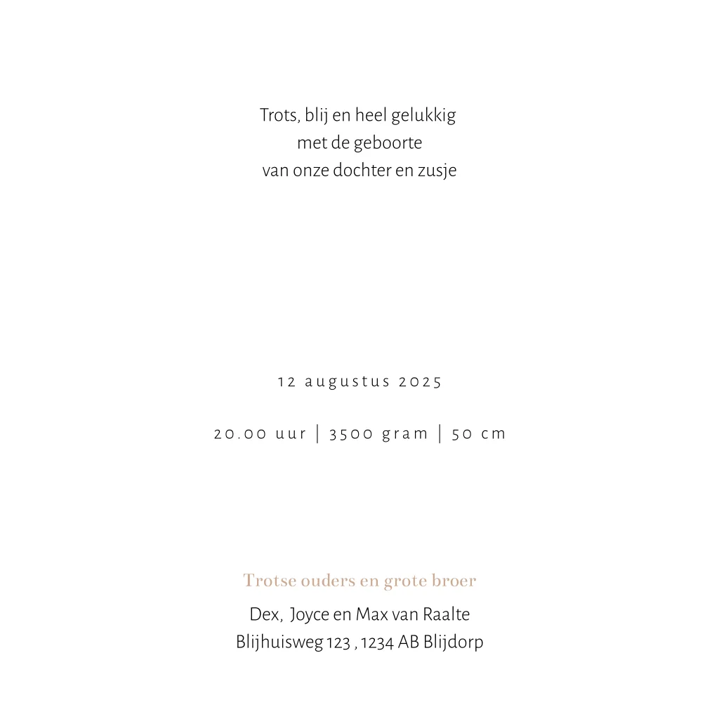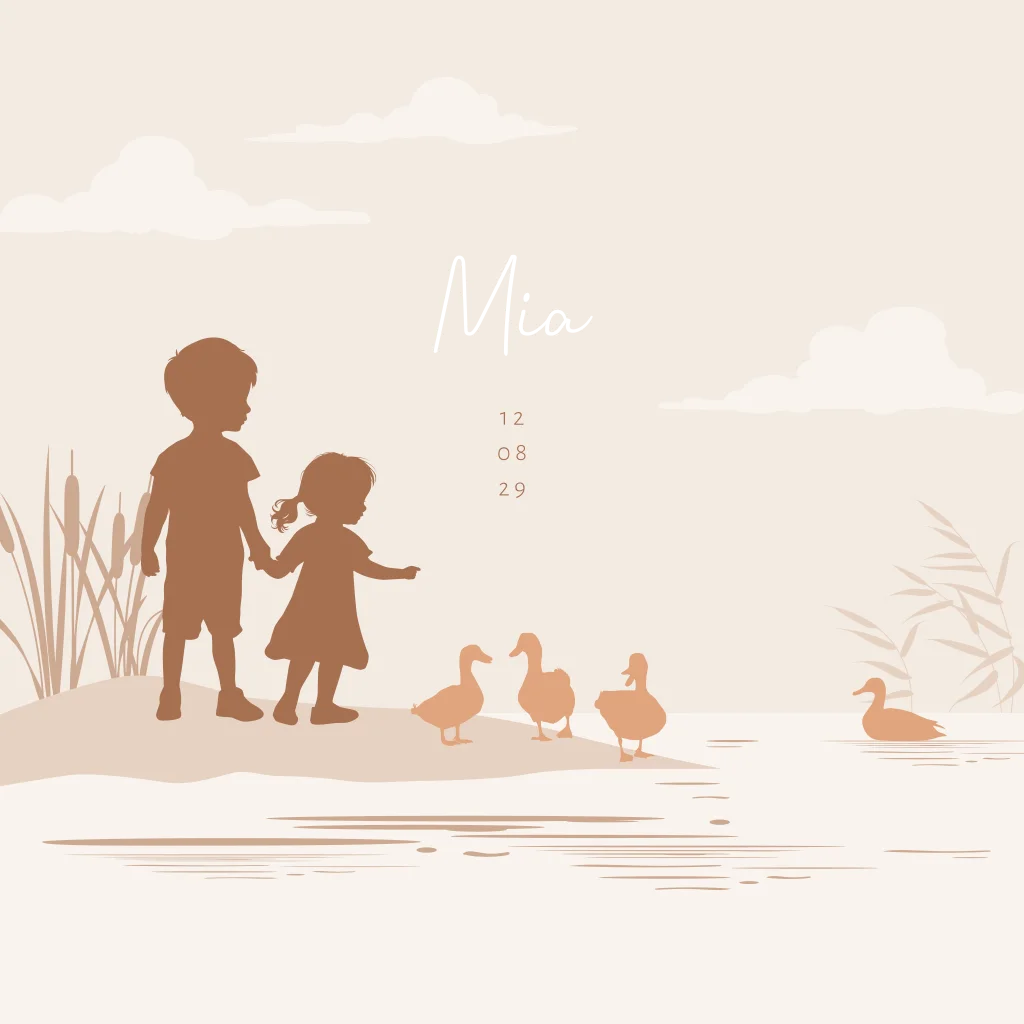 Silhouet geboortekaartje voor een meisje. Op dit kaartje zie je een silhouet van grote broer en zusje. De kindjes staan samen aan de waterkant naar de eendjes te kijken. Het roséfolie op dit geboortekaartje Mia zorgt voor een stijlvolle touch. Teksten, kleuren en silhouetten kun je aanpassen in de editor. Dit geboortekaartje voor jullie dochter is ook mogelijk voor een andere gezinssamenstelling. Hulp nodig? We staan voor je klaar! Bel, mail of chat gerust.