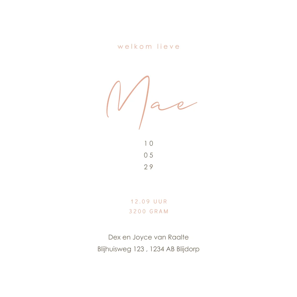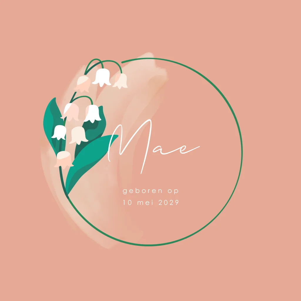 Dit geboortekaartje Mae voor een meisje is vrolijk en heeft roze tinten. De geboortebloem lelietje van dalen past bij de geboortemaand mei maar kan natuurlijk ook op zichzelf gebruikt worden. Dit bloemetje staat voor geluk, een perfecte start voor jullie kleine meid! Pas de geboortebloem, teksten en kleuren gemakkelijk aan in de editor.