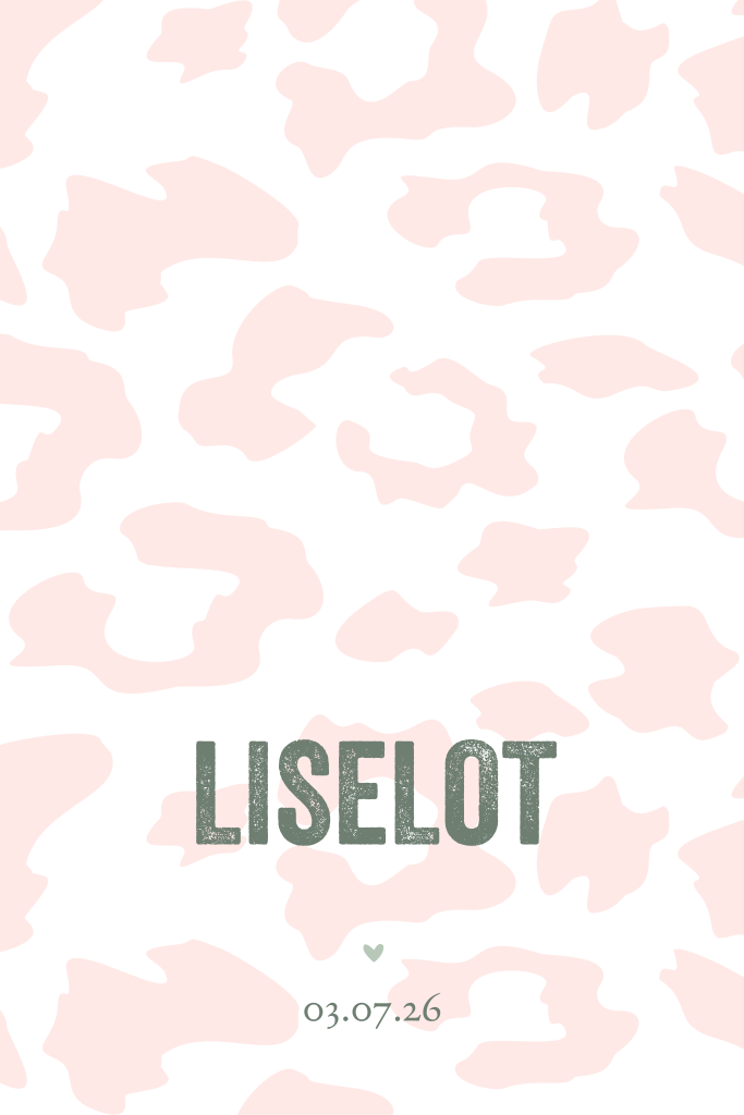 Hip geboortekaartje voor een meisje. De achtergrond van het kaartje Liselot bestaat uit een tijgerprint in zacht roze kleur.