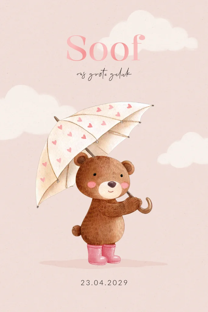 Lief geboortekaartje voor een meisje met een beer met paraplu en regenlaarzen aan. Dit geboortekaartje Soof heeft zachte roze kleuren met speelse afgeronde hoeken en hoogglans. Het gehele geboortekaartje is naar eigen wens aan te passen in onze online editor.