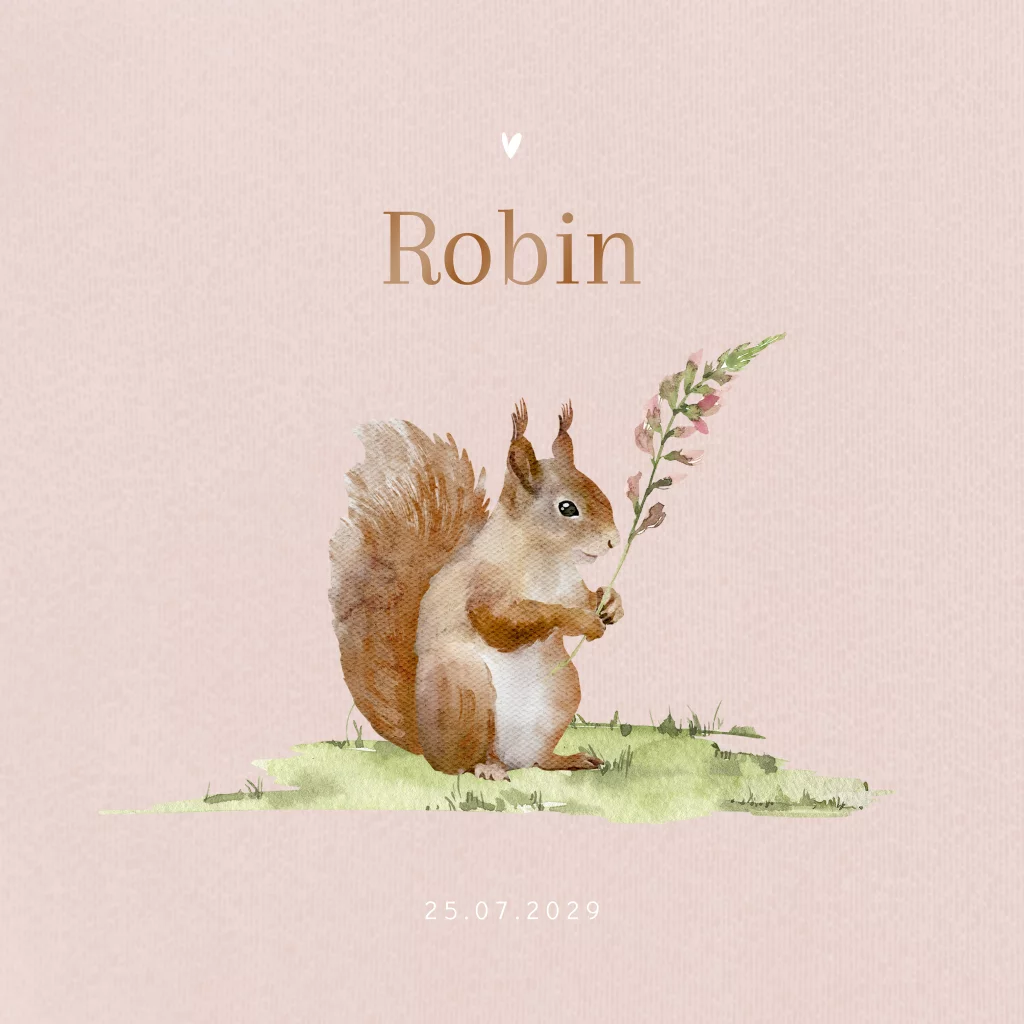 Hoogglans geboortekaartje voor een meisje met een aquarel van een eekhoorn met bloem. Pas de teksten, kleuren en lettertypes van dit geboortekaartje Robin naar je eigen smaak aan in de editor. Hulp nodig? Wij helpen je graag!