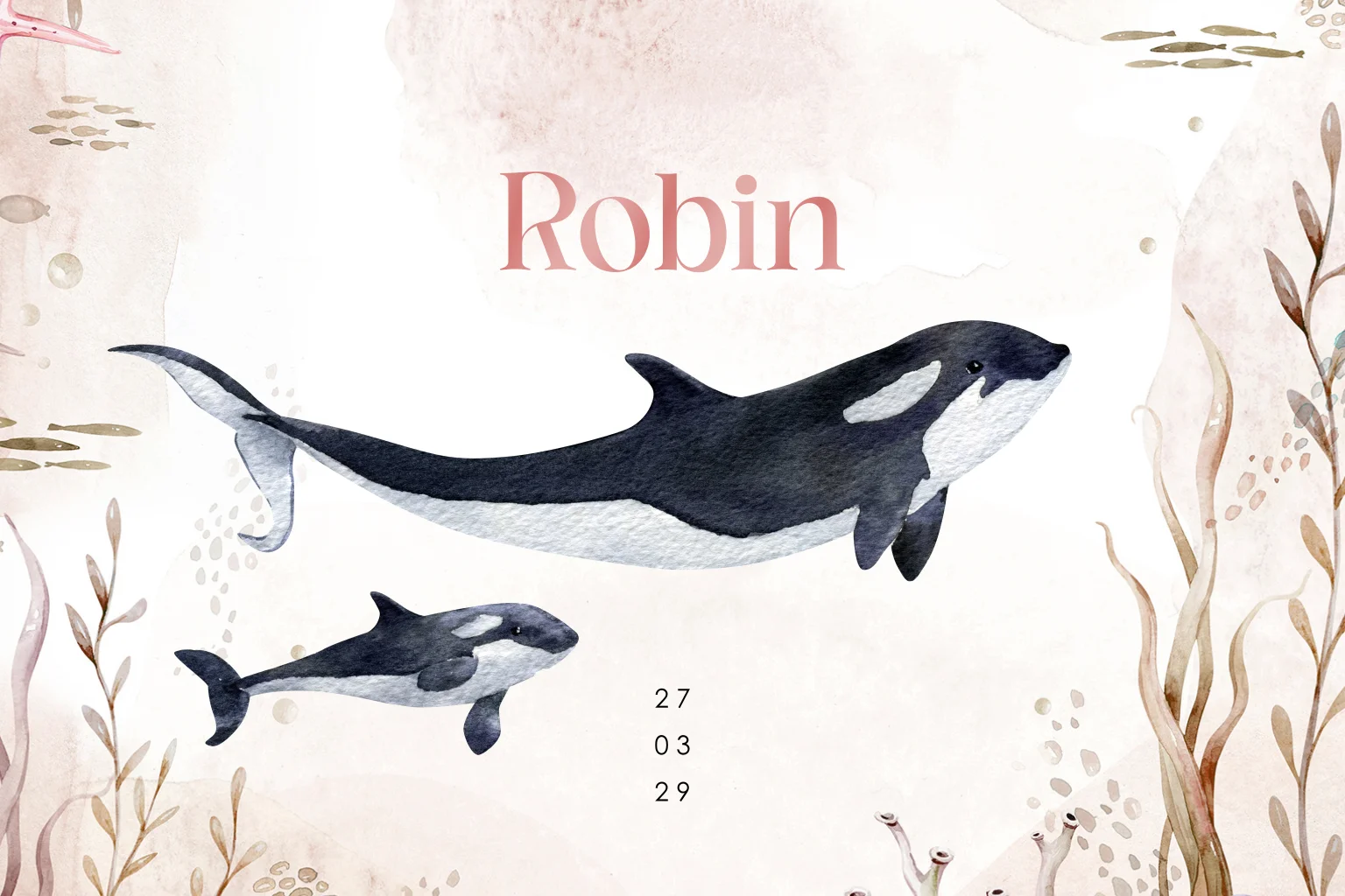 Dit geboortekaartje Robin is perfect voor een stoere meid die houdt van onderwaterdieren. Het kaartje is getekend in een watercolour stijl met een aquarel onderwaterwereld met koraal en een orca met een orca kalf. De kleurencombinatie van zachte roze met bruine kleuren geeft het kaartje een natuurlijke uitstraling. De naam van jullie dochter wordt gedrukt in écht hoogglans spot-uv lak. Dit geeft een mooi effect en de naam van jullie kleine meid zal zo zeker opvallen. Pas dit geboortekaartje voor een meisje naar je eigen smaak aan in onze ontwerpmodule.