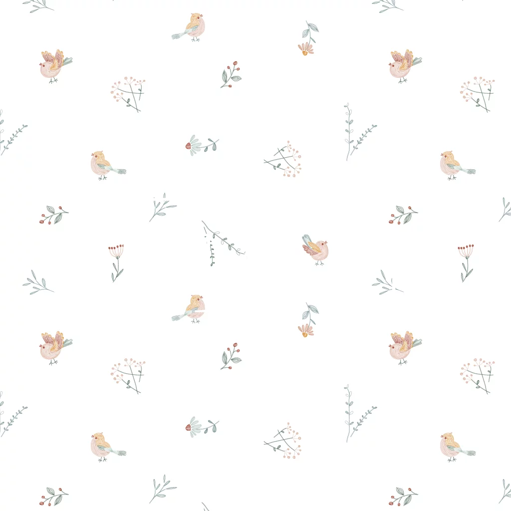 Jollein geboortekaartje met de schattige 'lovely birds' print. De achtergrond heeft een witte kleur met pastelkleurige aquarelbloemetjes en vogeltjes. De naam wordt in roségoud foliedruk gedrukt.