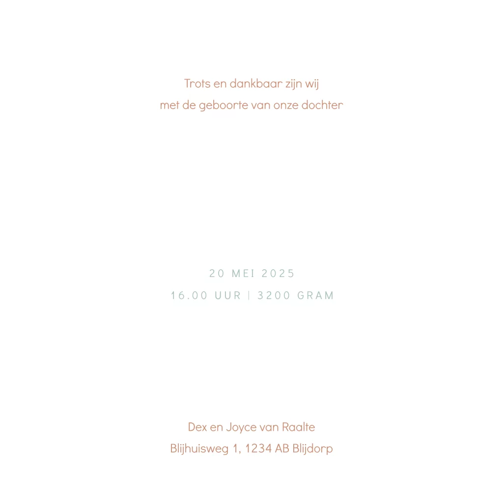 Dit geboortekaartje Fien is een ontwerp van Jollein® uit de Lovely birds collectie en is speciaal in samenwerking met Jollein® ontworpen. Alle designelementen staan daarom vast waardoor het ontwerp zelf niet aanpasbaar is. Je kunt de teksten uiteraard wel gemakkelijk aanpassen in de editor.