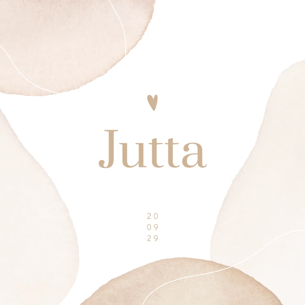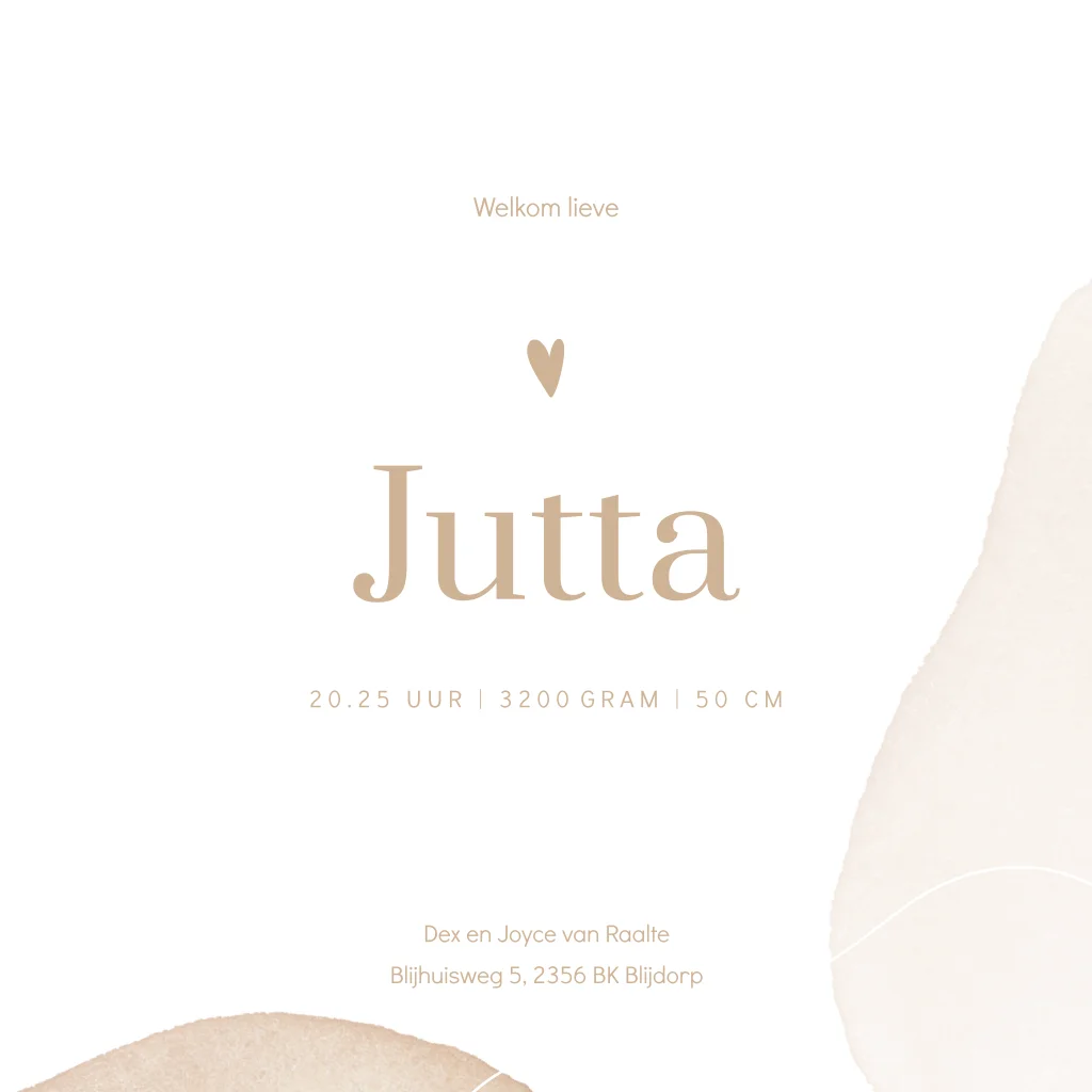 Abstract geboortekaartje met organische vormen in zacht roze en beige aquarel kleuren. Dit geboortekaartje Jutta voor een meisje oogt rustig door de neutrale zachte kleuren. Pas deze kaart naar je eigen smaak aan in de editor en combineer met een mooie envelop om het helemaal af te maken.
