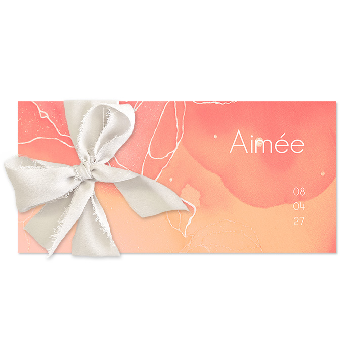 Ben je op zoek naar een uniek geboortekaartje voor jullie meisje? Dan is dit vrolijke geboortekaartje met een echt chiffon zijden lint perfect! Dit geboortekaartje heeft zomerse roze met oranje aquarel kleuren met abstracte witte lijnen en vormen. Het zijden lint maakt deze originele kaart helemaal af. Pas de kleuren, teksten en lettertypes gemakkelijk aan in de editor. Hulp nodig bij het opmaken van deze kaart? Bel, mail of chat ons gerust. Wij helpen je graag!