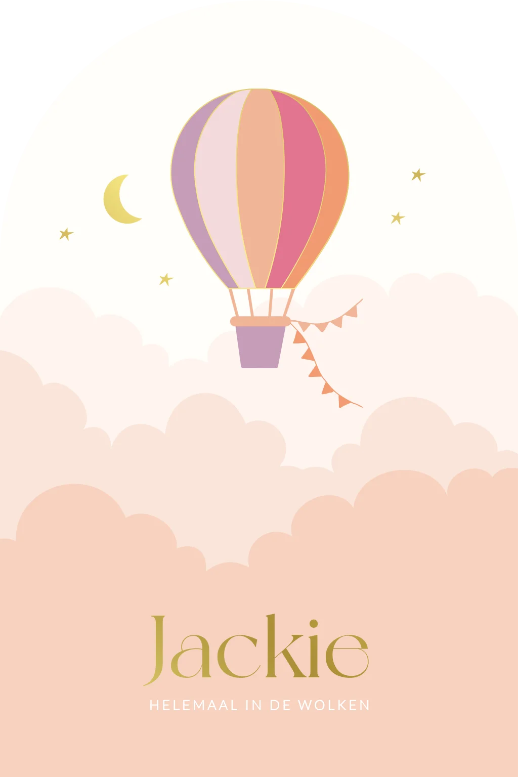 Luxe geboortekaartje voor een meisje in een dubbele boogvorm. Het ontwerp Jackie heeft zacht roze en perzikkleurige wolkjes. In de lucht hangt een luchtballon met een maan en sterren. De naam wordt in prachtig goudfolie gedrukt. Pas deze kaart naar je eigen smaak aan in de editor en combineer met een mooie envelop en sluitzegel om het helemaal af te maken.