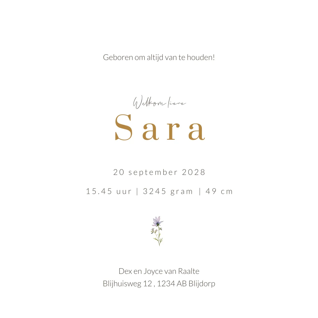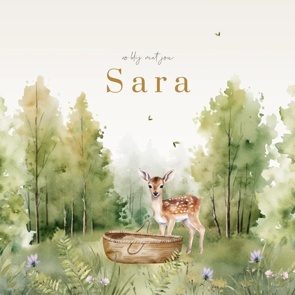 Dit prachtige geboortekaartje Sara voor een meisje is voorzien van een schilderachtige aquarel van een bos, babymandje en een hert. De warme kleuren en getekende illustratie geven het kaartje een lieflijke en natuurlijke uitstraling. Dit geboortekaartje is ideaal voor wie op zoek is naar een lief, natuurlijk en illustratief ontwerp.