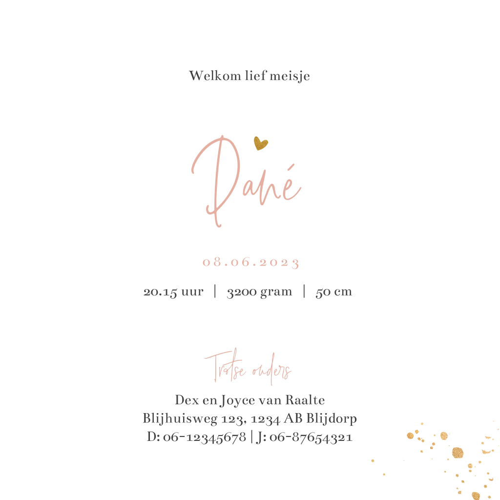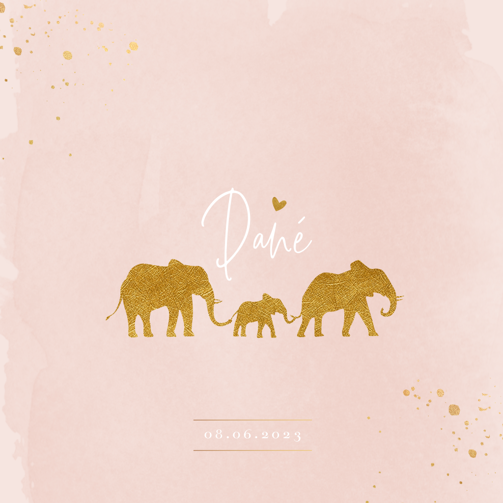 Aquarel geboortekaartje voor een meisje in een mooie combinatie van roze met wit en goudkleur. Op dit kaartje Dané staan 2 grote olifanten en een klein baby olifantje. Je kunt dit ook aanpassen naar een andere gezinssamenstelling. Verder heeft deze kaart een lieve uitstraling en de kleuren zijn gemakkelijk aan te passen.