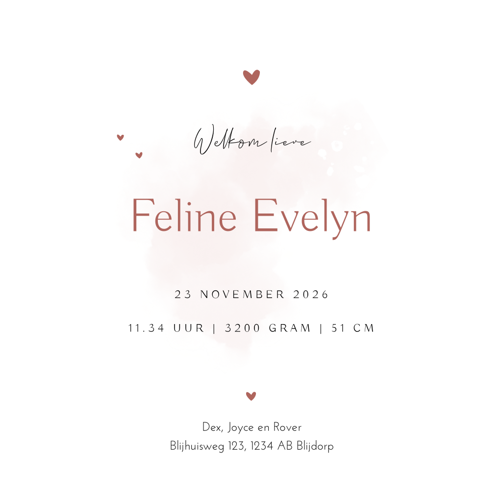 Lief silhouet geboortekaartje voor een eerste kindje, een dochter. Op dit meisjeskaartje Feline een meisje op een fiets met daarachter een hondje. Verder op dit kaartje een roze aquarel achtergrond met witte spetters en kleine hartjes. Pas het kaartje naar je eigen smaak aan in de editor. Ook mogelijk met een ander silhouet of voor een andere gezinssamenstelling.