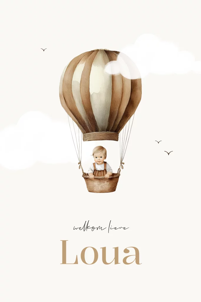 Schattig luchtballon geboortekaartje voor een meisje. Dit geboortekaartje Loua heeft een prachtig design van een meisje in een luchtballon mandje. De luchtballon zweeft in de lucht tussen de wolken en vogeltjes. Dit geboortekaartje heeft een rustig design met afgeronde hoeken. Het gehele kaartje is naar eigen wens aan te passen in onze online editor. Maak dit kaartje voor jullie dochter helemaal af met de bijpassende sluitzegel en de envelopkleur zand.