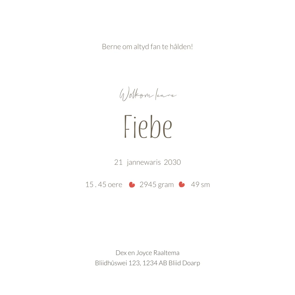 Fries geboortekaartje voor een meisje. Op dit geboortekaartje Fiebe zie je een baby mandje met daaraan ballonnen met de Friese vlag. Er staat een schattig knuffel gansje bij. Pas dit geboortekaartje gemakkelijk aan in de editor. Hulp nodig? Bel, mail of chat ons gerust. Wij helpen je graag!