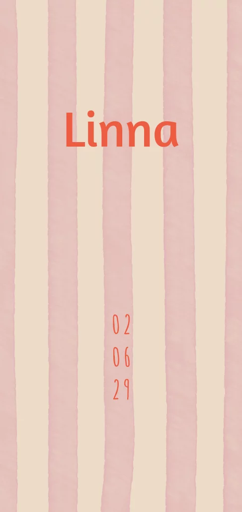 Geboortekaartje voor een meisje met strepen. Dit geboortekaartje Linna heeft een apart design waardoor deze zeker zal opvallen. Pas de kleur van de strepen eenvoudig aan in de editor. Hulp nodig met ontwerpen? Ons team helpt je graag.