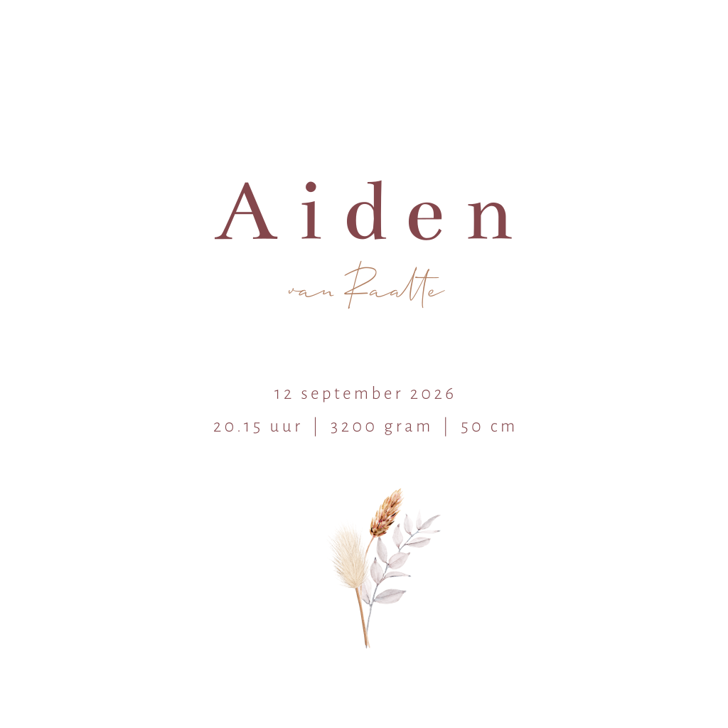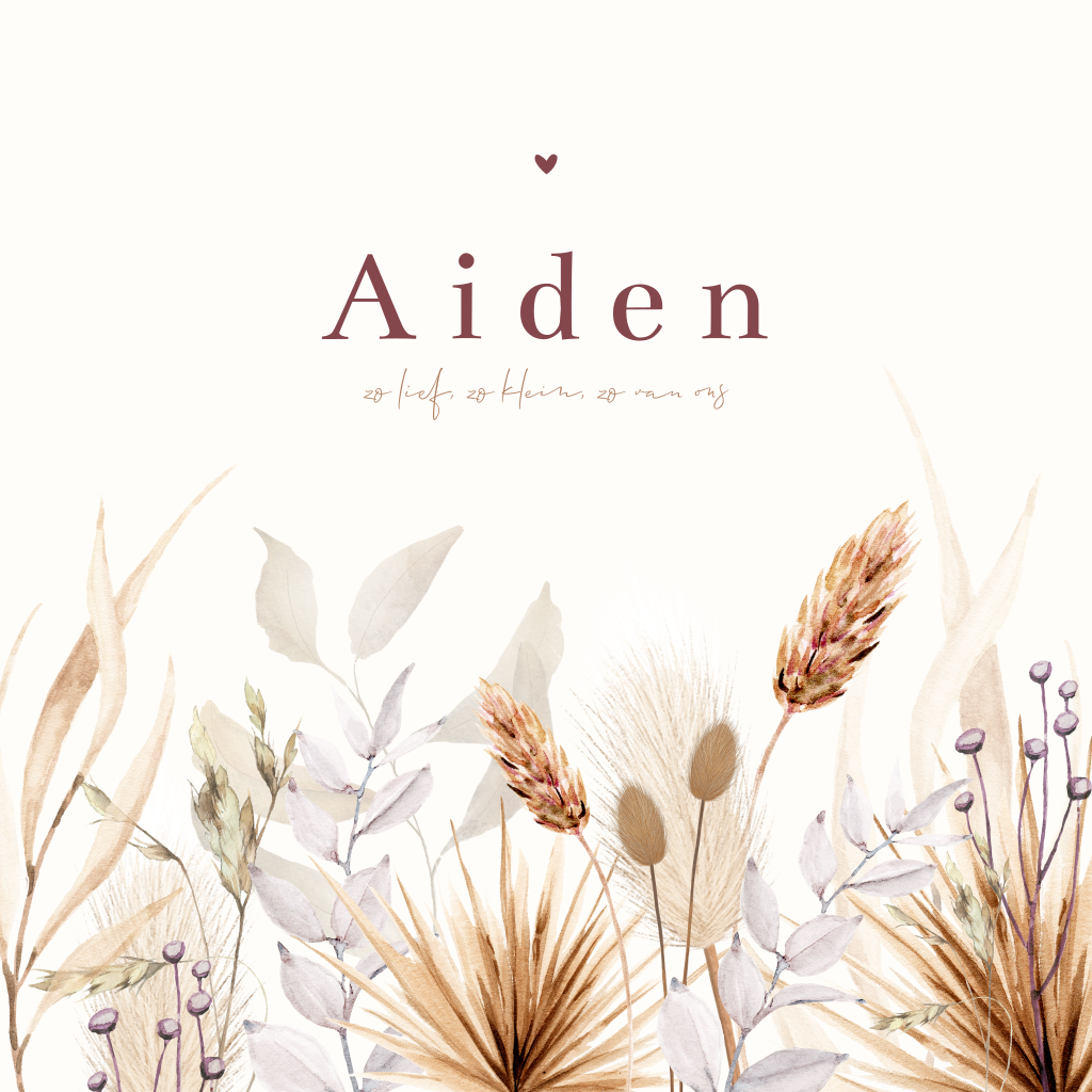 Meisjes geboortekaartje met mooie aquarel wilde veld en droogbloemen en een lichte achtergrond. De teksten en lettertypes van dit babykaartje Aiden zijn aan te passen in de editor.