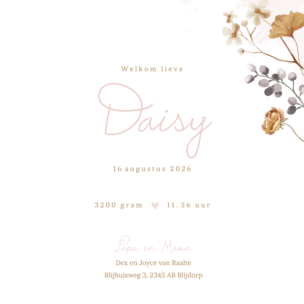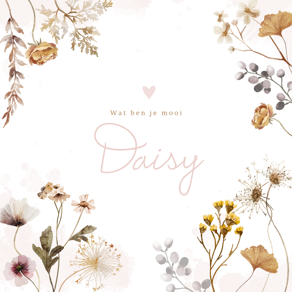 Romantisch geboortekaartje voor een meisje met mooie wilde aquarel bloemen. Achter de veldbloemen licht roze aquarel spetters. De teksten en lettertypes van dit babykaartje Daisy zijn aan te passen in de editor.