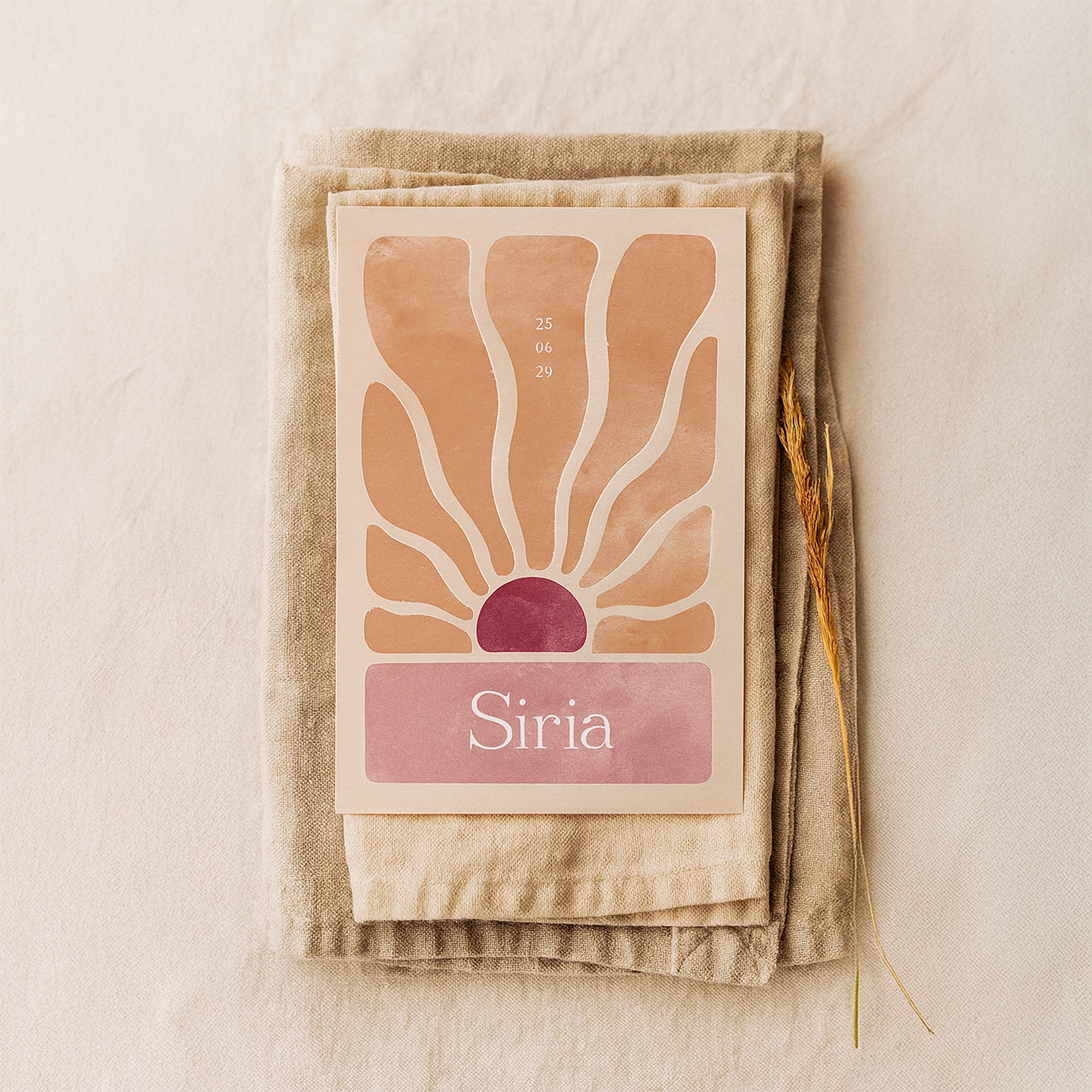 Op zoek naar een geboortekaartje die opvalt? Kies dan voor dit meisjes geboortekaartje met een aquarel van een zon. Dit geboortekaartje Siria voor een meisje heeft een warme vintage uitstraling door de zachte kleuren en retro zon. Je kunt de kaart naar je eigen wensen aanpassen in de editor. Hulp nodig bij het ontwerpen? Neem contact met ons op!