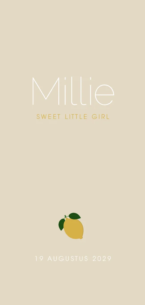 Een basic geboortekaartje voor een meisje. Op dit rustige babykaartje, voor jullie "sweet little girl", slechts deze tekst, de naam en geboortedatum, samen met een citroentje.