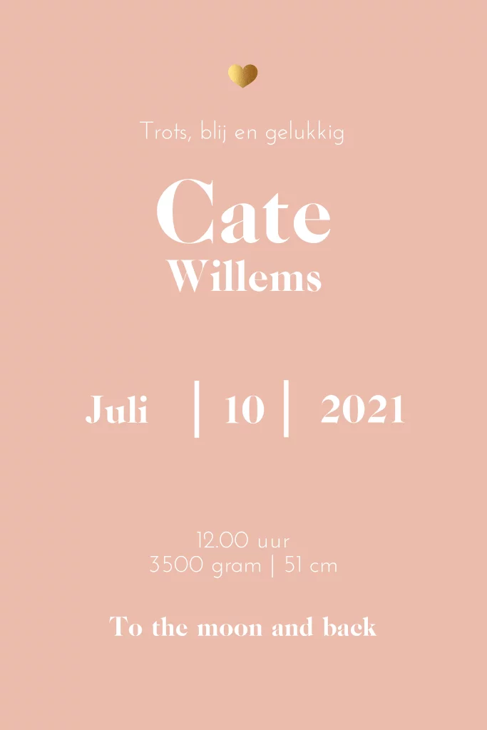 Dit geboortekaartje voor een meisje heeft een basic look. Het goud kleurig hartje maakt de kaart schattig en de kleur oud roze maakt de kaart echt meisjes achtig.
